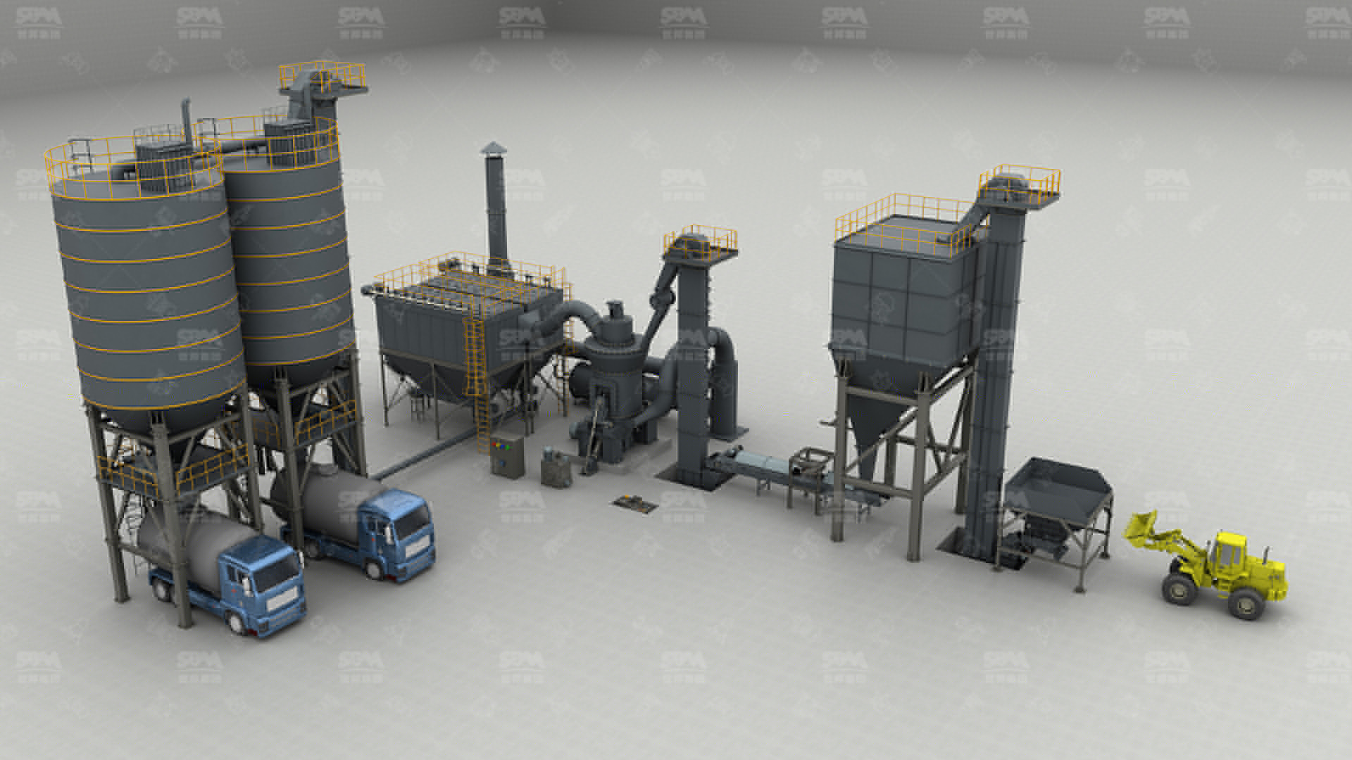 原料經變頻皮帶給料機均勻定量連續地送入主機磨室內進行研磨。粉磨后的物料被風機氣流送入選粉機進行分級,在分析機的作用下,不符合細度要求的物料落入磨室內重新碾磨,合格的物料則隨氣流經管道進入旋風集粉器內,進行分離收集,經排料裝置排出即為成品粉體。分離后的氣流通過旋風集粉器上端回風管進入風機。該生產系統在負壓密閉條件下運行,并配有脈沖除塵器無粉塵外溢,符合國家環保標準。